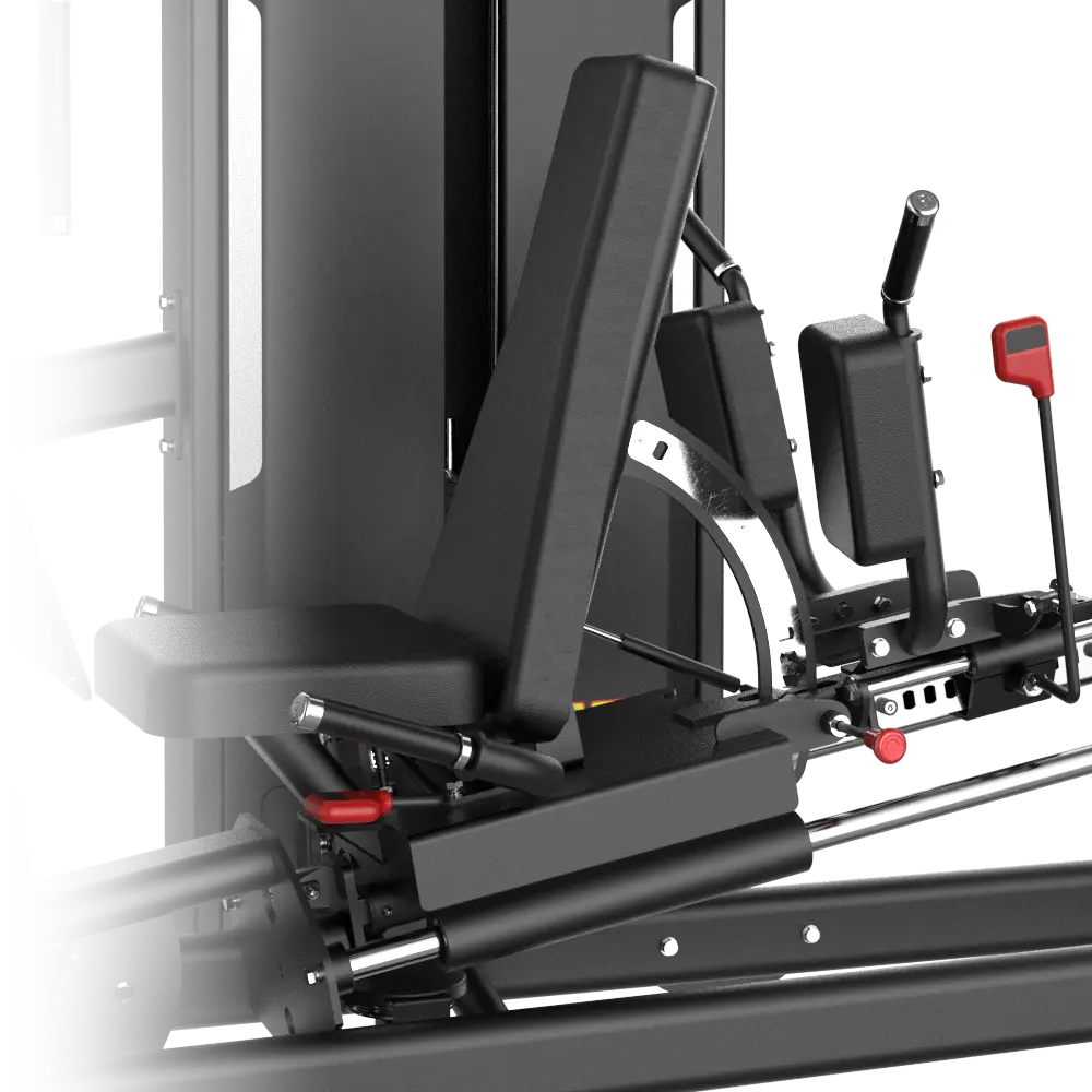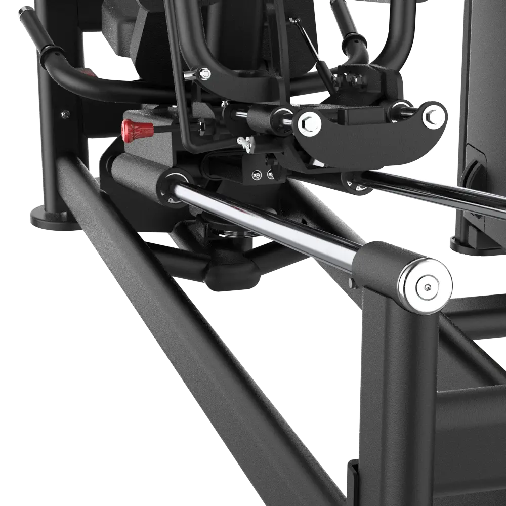 يُعد جهاز SA040 ثورة في تدريبات الجزء السفلي، حيث يجمع بين وظيفتين أساسيتين في منصة واحدة بنظام الأوزان المختارة (Selectorized). صُمم الجهاز لدمج نظام توجيه خطي (Linear Guide) عالي الدقة مع آلية بكرات انسيابية، مما يوفر تجربة تدريبية تتسم بالثبات والسلاسة الفائقة. وبفضل مسند الظهر ثنائي الوضعيات، يتيح الجهاز الانتقال بين تمرين "دفع الأرجل من وضع الجلوس" وتمرين "هاك سكوات من وضع الاستلقاء" (Supine Hack Squat)، مما يلبي تطلعات كافة المستخدمين بدءاً من مرحلة بناء القوة وصولاً إلى نحت العضلات.