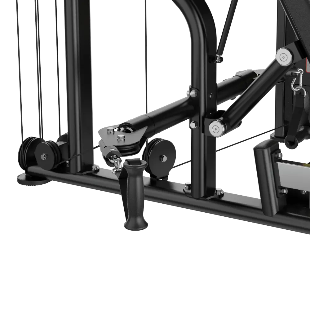 1. هندسة القبض المتعددة: تم تزويد الجهاز بمقابض متعددة تدعم مسارات دفع متنوعة (واسعة، ضيقة، أفقية، وعمودية)، مما يتيح تنوعاً تدريبياً كبيراً يستهدف زوايا مختلفة في الصدر والأكتاف. كما يسمح ذراع التشغيل القابل للضبط في 6 وضعيات بتخصيص نقطة البداية حسب طول المستخدم والوضعية التدريبية المفضلة.