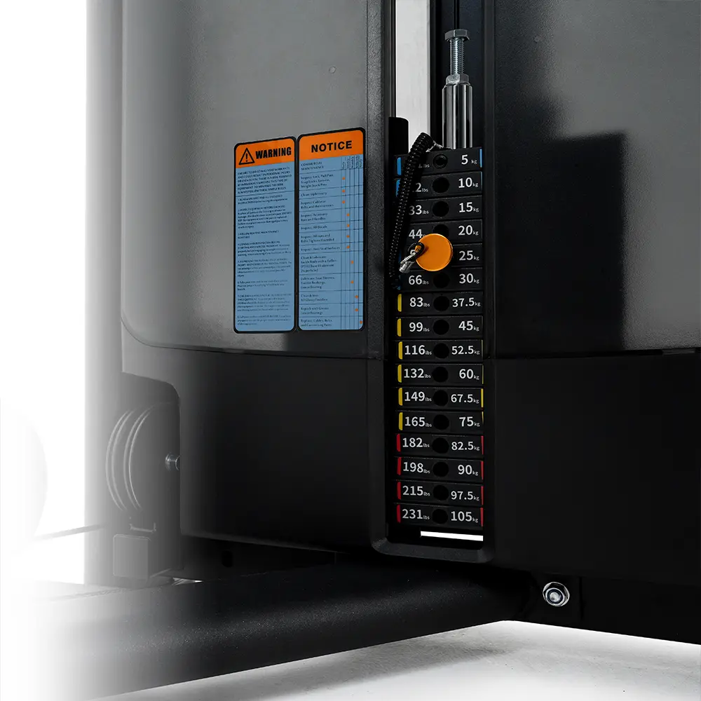يستخدم الجهاز أوزانًا من الحديد الزهر عالي الكثافة مع طلاء مسحوقي فاخر مقاوم للتآكل والصدأ. وزن القاعدة 5 كجم مع لوحتي تعديل دقيق 2.5 كجم، ما يتيح تدريبًا تدريجيًا واحترافيًا يدوم طويلاً.